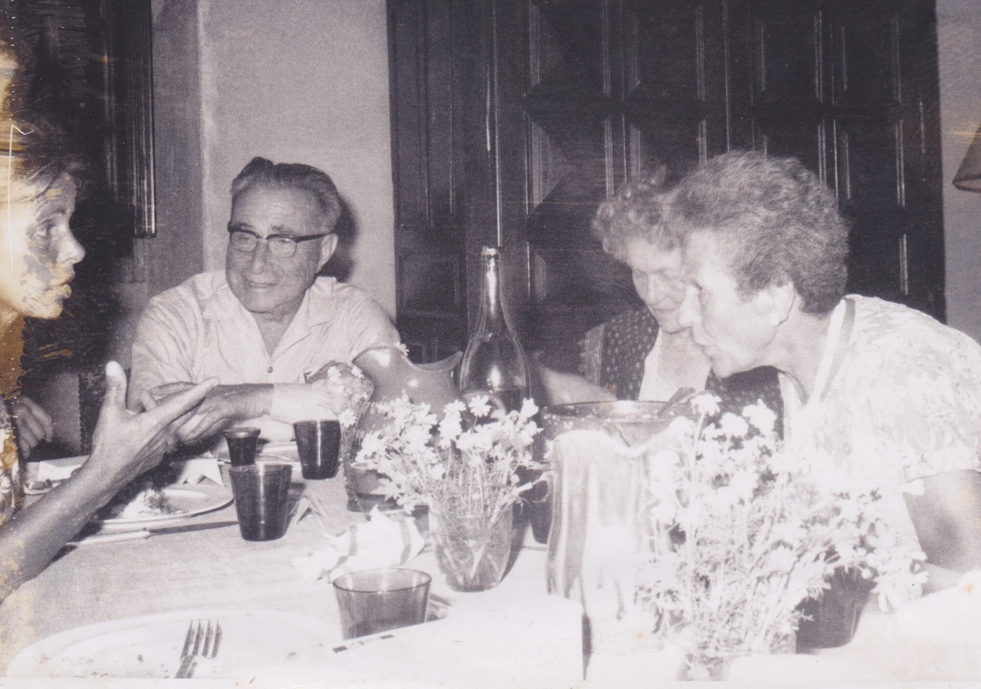 This is a spontaneous dessert that happens during peach season which coincided with Tante Suzanne’s annual visit to the grandparents’ house. It was not “tres distingue” but Suzanne would peel a fresh peach, cut bites off the stone, and drop them in her wine glass. Then she would fill the glass with red wine and stir in a spoon of sugar. She’s the one second to the right, working on her dessert. Then Anny, on the left, would decide that was a good idea and imitate Suzanne. And then Mamy on the right and Lepere in the middle would have to concede it was tasty — if very “pluque” — Lepere’s word for bumpkin—and they would make their own Peches Paysannes.