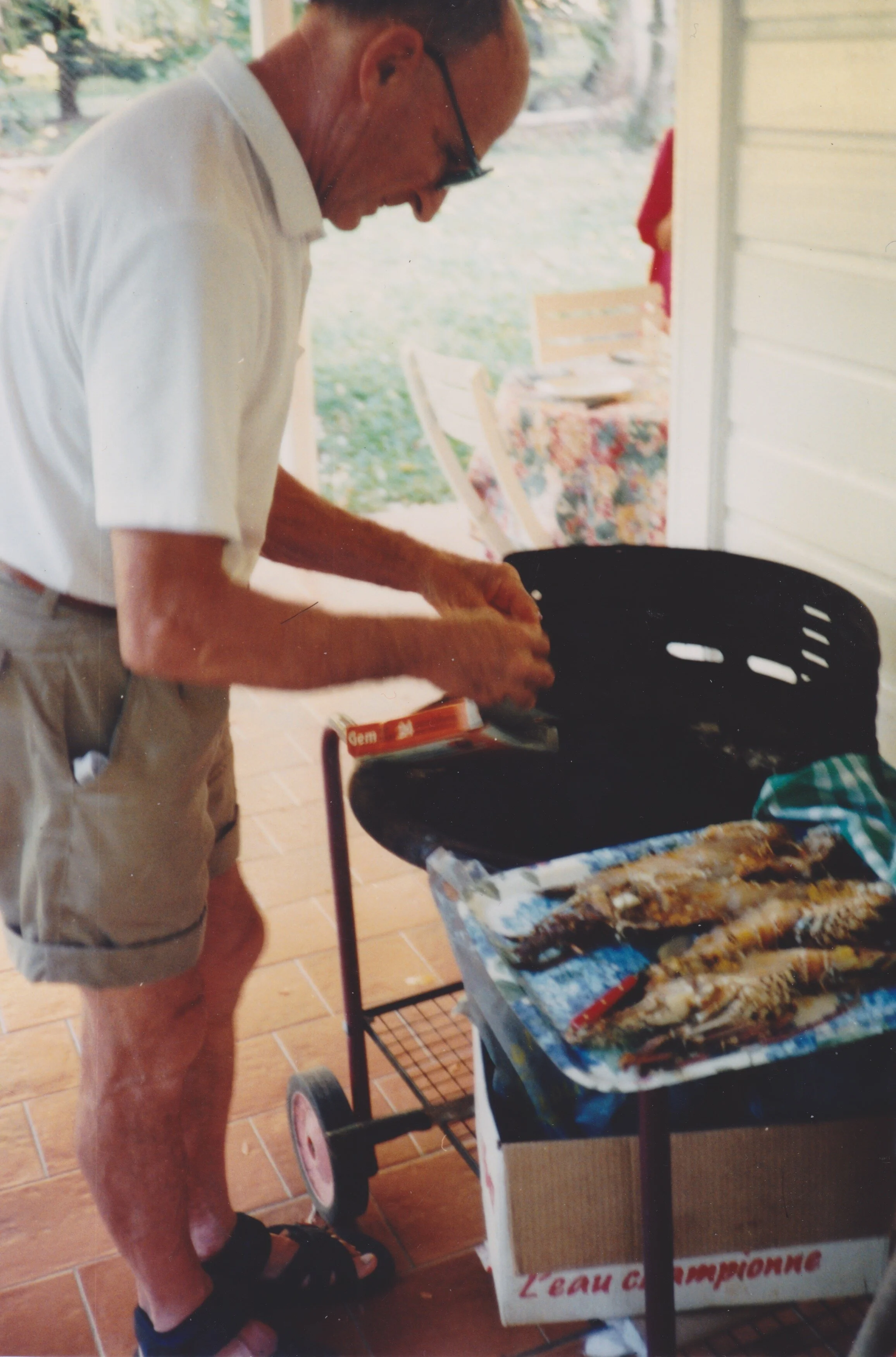After oiling the grill to prevent sticking, throw the fish on the grill over the coals and cook sparingly, maybe 5 minutes. Flip the fish over and grill the other side, only 4 minutes. Remove from the grill. Lou then stripped the skin off and fileted the fish, but you don’t have to if the scales were removed. Serve the fish with some lemon and maybe another sprinkling of salt and pepper.